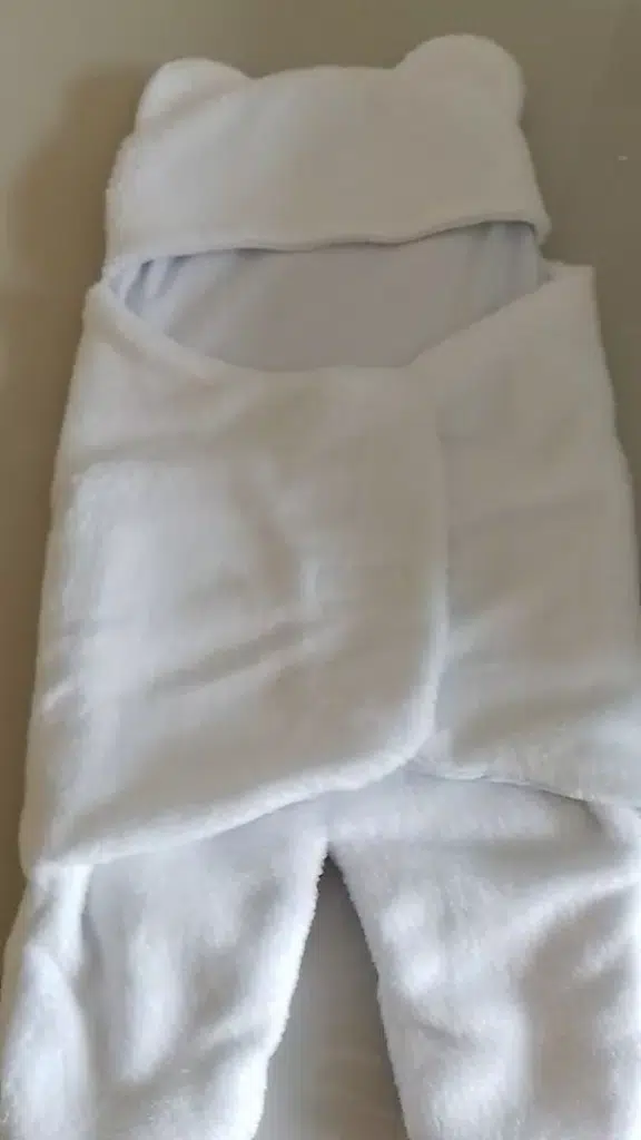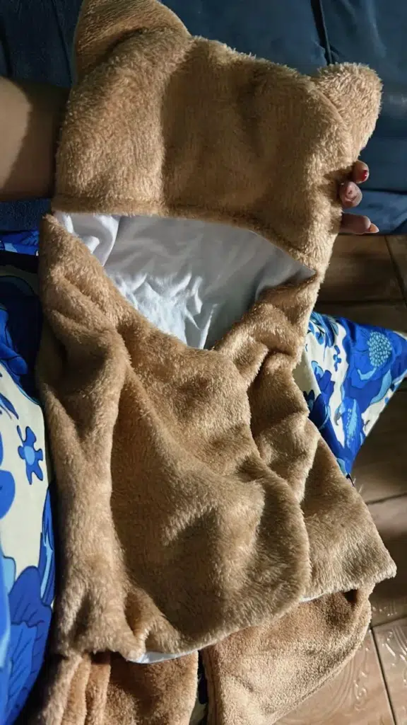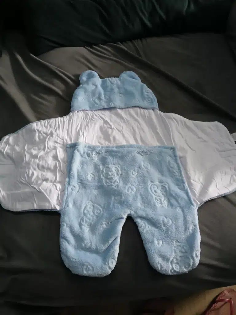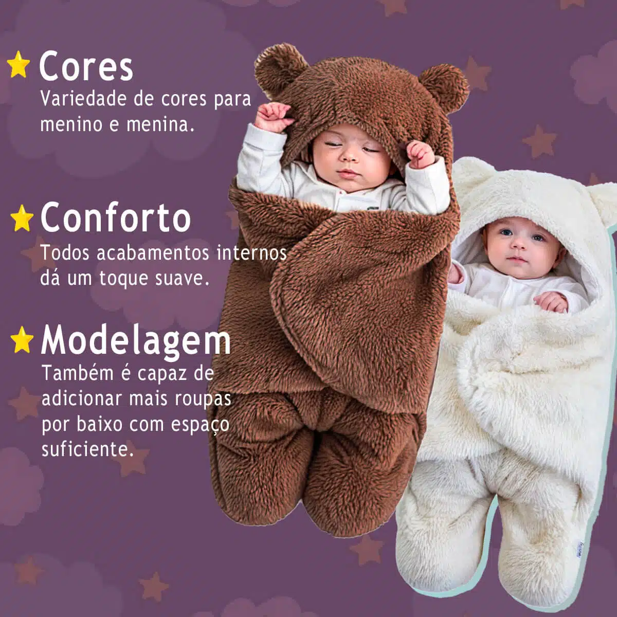 Diferente dos modelos comuns (grossos e ásperos), o nosso possui pelúcia fofinha e fininha, que mantém o bebê aquecido sem irritar a pele.